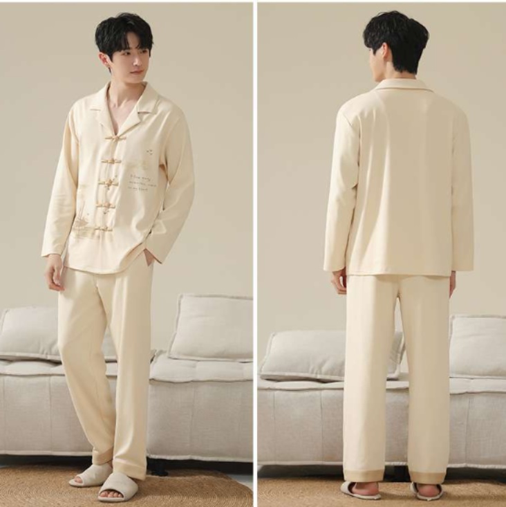 胸元のポケットと淡い色合いが洗練された印象を与え、格調高いリラックスタイムを演出します。
