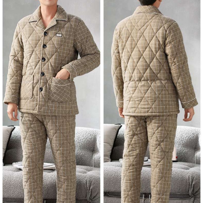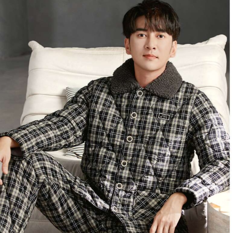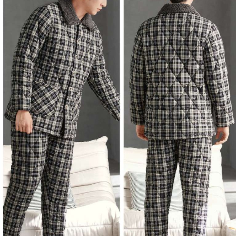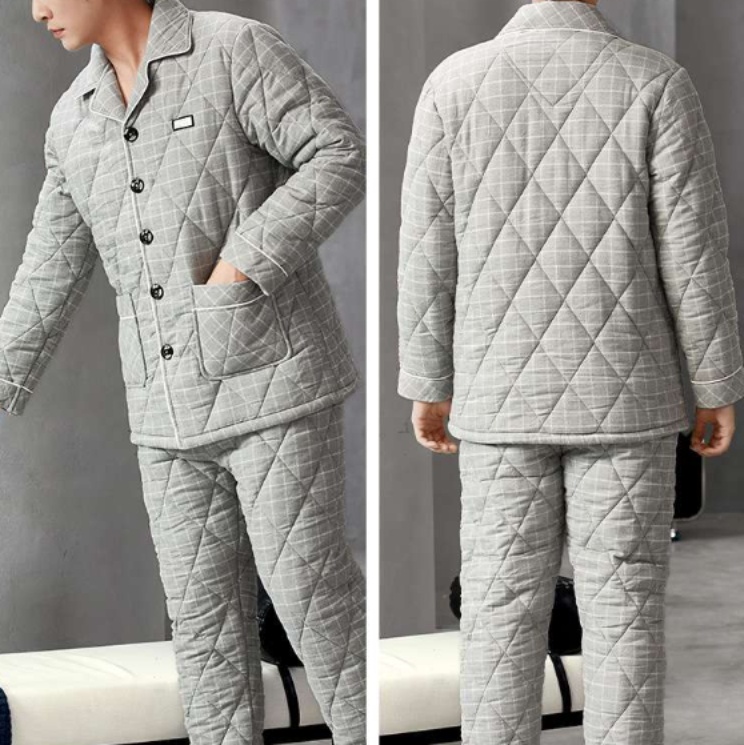 メンズパジャマの決定版。ふわふわの襟元と暖かな中綿入りが特徴的な綿素材の上下セット。